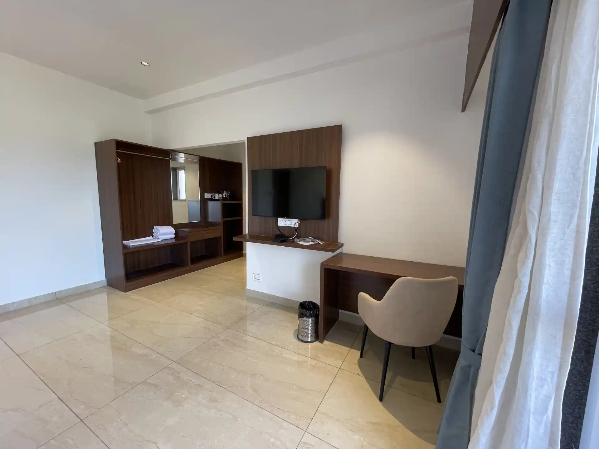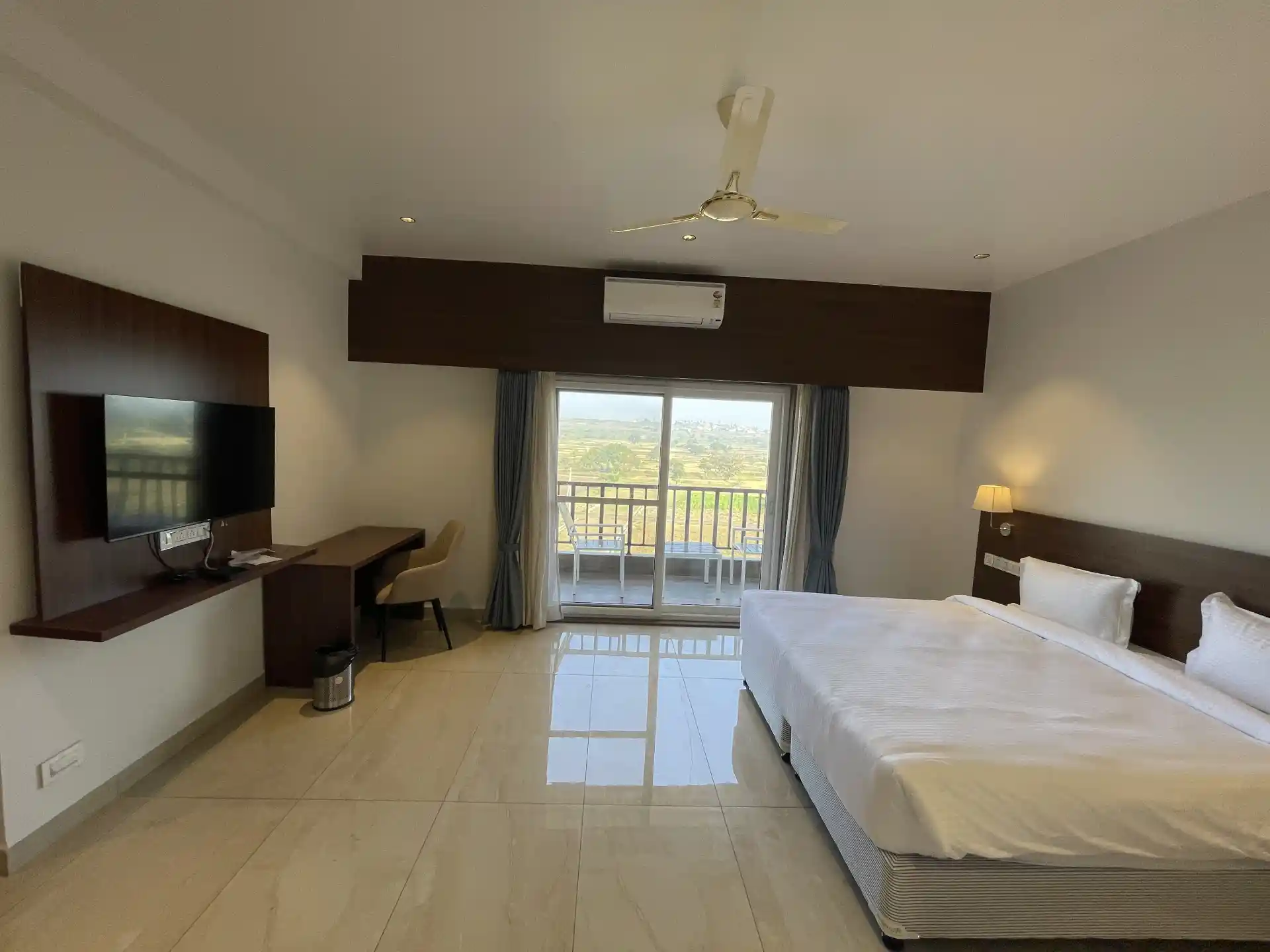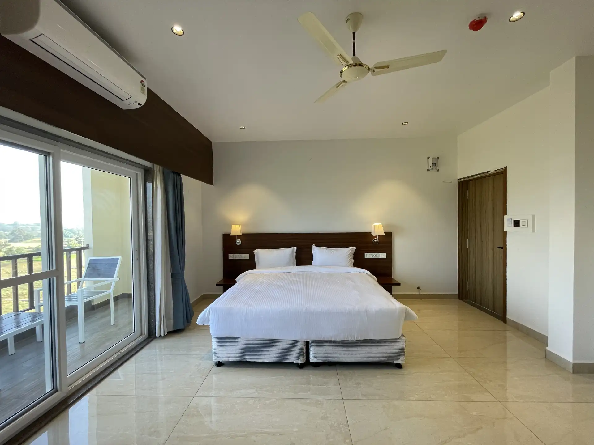The Deluxe Room offers a spacious 375 sq. ft. of comfort, thoughtfully designed to provide a relaxing stay. It features a well-appointed layout with modern amenities including air-conditioning, a flat-screen TV, tea and coffee packets with an electric kettle for your convenience. Step out onto your private balcony to enjoy fresh air and a peaceful view, making it the perfect blend of comfort and leisure for every guest.